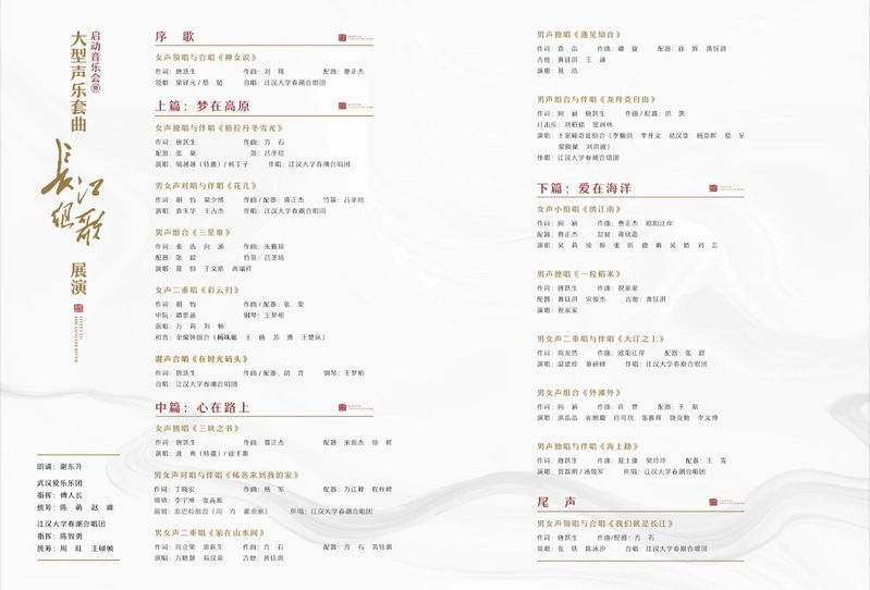 9月15日开幕式中,我院院长张轶、音乐表演系主任吴莉老师、音乐教育与合唱指挥系谭萌老师共同参演“启动音乐会暨大型声乐套曲《长江组歌》展演”,三位老师将以精湛演唱诠释长江主题作品,用歌声传递对母亲河的深情礼赞,与此同时,我院音乐教育与合唱指挥系陈智勇老师将带领春潮合唱团全程参与此次展演,借和声的层次与力量,将长江从源头到入海的壮阔历程、从文明记忆到时代新貌的变迁娓娓道来,共同为音乐周开启精彩序幕。