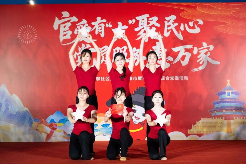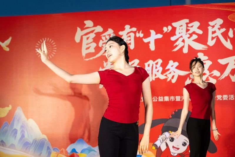 9月19日晚,音乐学院受邀参加沌阳街道官士墩社区“官爱有‘+’聚民心,党员服务惠万家”党员公益集市开幕式。学院以学生社团为纽带,组织“民舞社”学子登台献艺,将专业舞蹈艺术送到居民家门口。
