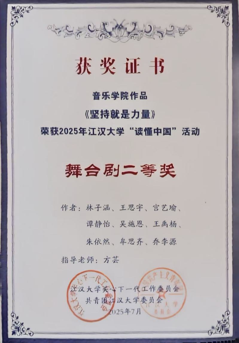 近日,在2025年江汉大学“读懂中国”活动中,音乐学院的舞台剧作品《坚持就是力量》凭借出色的演绎和深刻的内涵,荣获二等奖。