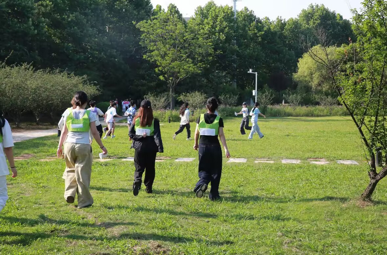 下午四点,身着彩色队服、背后贴着名牌的同学们精神饱满地齐聚赛场。随着工作人员指令下达,比赛在绿道上火热开启。选手们瞬间化身为活力四射的“战士”:有人凭借敏捷身手如风穿梭,出其不意撕下名牌;有人则展现智慧,与队友默契配合,通过精妙战术围追堵截。现场惊呼与欢笑此起彼伏,紧张刺激的对抗中洋溢着纯粹的快乐与释放。奔跑、追逐、协作、策略,每一个瞬间都是压力的宣泄和身心的舒展。