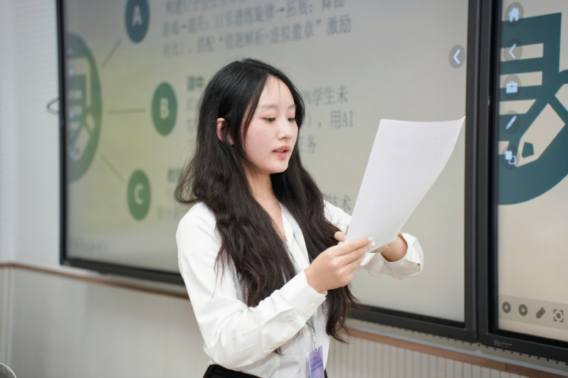 我院2024级硕士研究生杨羽佳同学在“AI时代音乐教学改革”分会场宣讲论文《AI时代背景下中小学音乐翻转课堂的实践与探索》。阐述了“课前AI分层预习+课中AI深度探究+课后AI个性拓展”的核心路径。并通过具体案例,分享AI技术在课前按基础推送动画、智能乐谱等分层资源;课中用AI课件破难点、辅助创作并评分;课后追踪数据定向推送学习内容等细节。同时针对“学生预习动力不足”等问题,提出分层任务、学科化探究设计等优化策略。她表示:“此次参会是一次难得的学习机会,通过与学界前辈、同仁的思想碰撞,我对AI时代音乐教育的未来发展有了更清晰的认知。”
