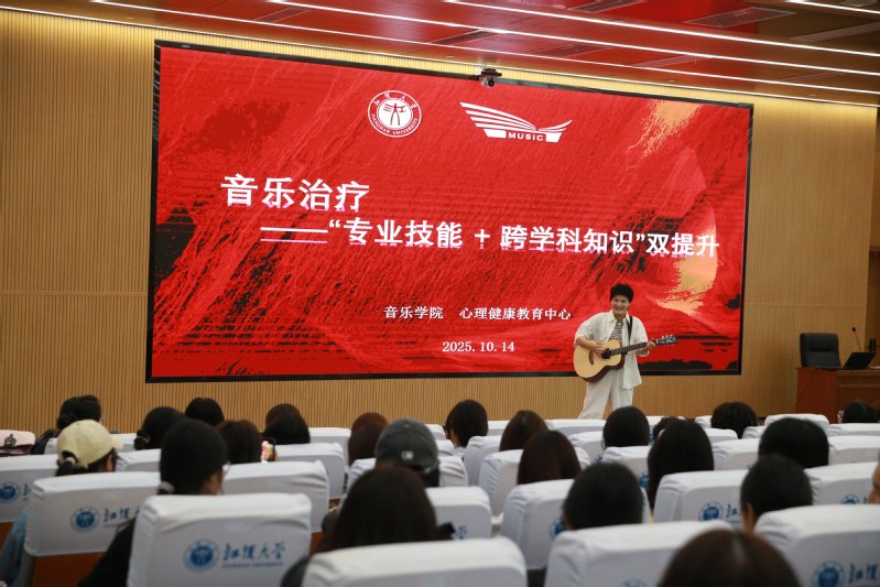 2025 10 14 日中午,江汉大讲坛在科创大楼炳灵厅温情开讲。音乐学院与心理健康教育中心联合特邀杭州 Bon Bon 艺术疗愈中心创始人、美国注册音乐治疗师王祎非女士,带来《音乐治疗—— 解锁音乐专业就业新方向》专题讲座江汉大学心理健康教育中心及音乐学院部分教师与各学院学生代表共同到场聆听。