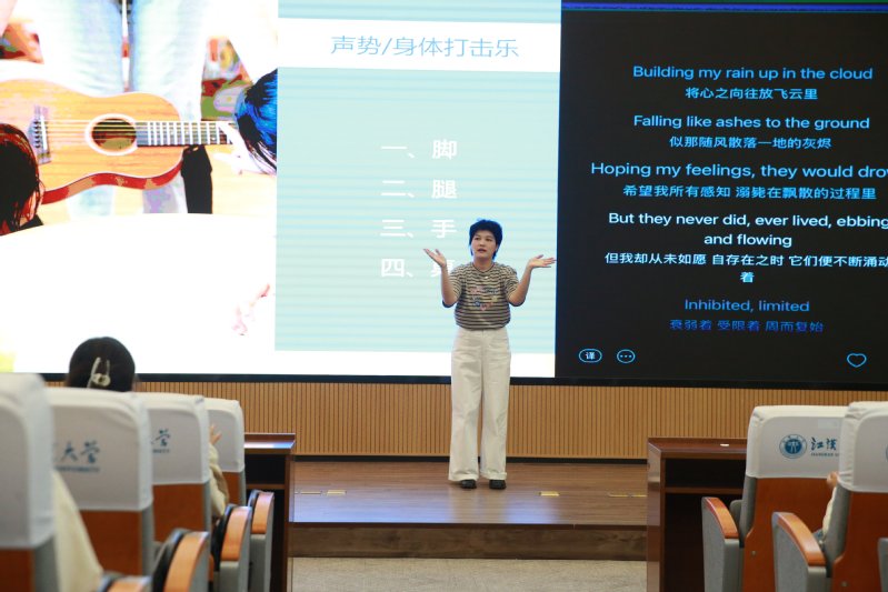 讲座尾声的互动环节,更是让师生亲身感受音乐的疗愈魔力。王祎非老师带领大家开展身体打击乐——即拍打身体某个部位,并伴随音乐旋律进行律动的分组活动:有人用手掌拍击节奏,有人以脚尖轻点地面,有人靠手指敲击桌面,不同的身体打击乐在协作中汇成统一旋律。在轻松的音乐互动里,师生们直观体会到“音乐无需专业技巧,也能成为沟通与放松的工具”,深刻理解了音乐治疗的实用性与普适性。